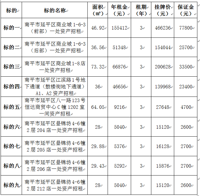 南平市延平區(qū)商業(yè)城1-6-3(前部)一處資產(chǎn)、江濱路1號(hào)地下通道、晝錦坊4-6幢等9處資產(chǎn)招租)